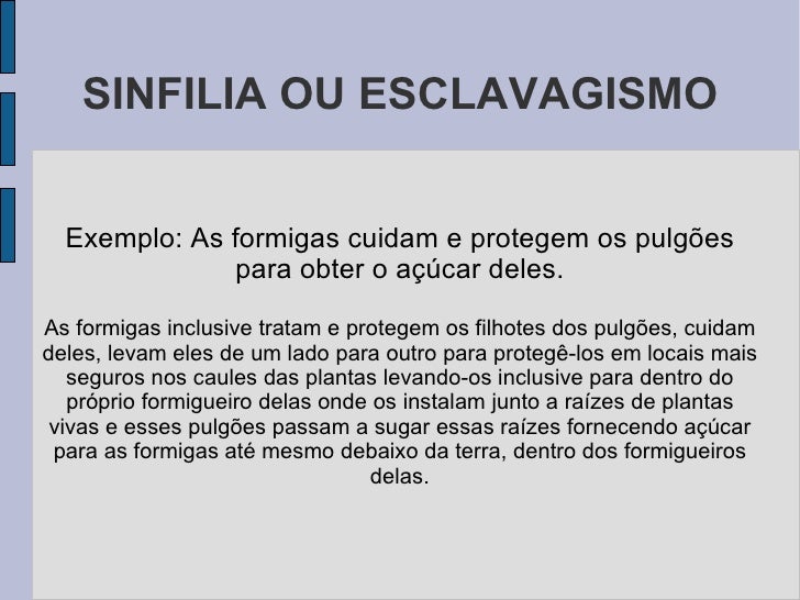 22. 22. SINFILIA OU ESCLAVAGISMO Exemplo: As formigas cuidam e protegem os pulgões para obter o açúcar deles. As formigas inclusive tratam e protegem os filhotes dos pulgões, cuidam deles, levam eles de um lado para outro para protegê-los em locais mais seguros nos caules das plantas levando-os inclusive para dentro do próprio formigueiro delas onde os instalam junto a raízes de plantas vivas e esses pulgões passam a sugar essas raízes fornecendo açúcar para as formigas até mesmo debaixo da terra, dentro dos formigueiros delas.