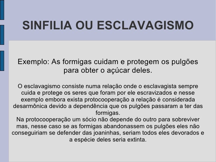 23. 23. SINFILIA OU ESCLAVAGISMO Exemplo: As formigas cuidam e protegem os pulgões para obter o açúcar deles. O esclavagismo consiste numa relação onde o esclavagista sempre cuida e protege os seres que foram por ele escravizados e nesse exemplo embora exista protocooperação a relação é considerada desarmônica devido a dependência que os pulgões passaram a ter das formigas. Na protocooperação um sócio não depende do outro para sobreviver mas, nesse caso se as formigas abandonassem os pulgões eles não conseguiriam se defender das joaninhas, seriam todos eles devorados e a espécie deles seria extinta.