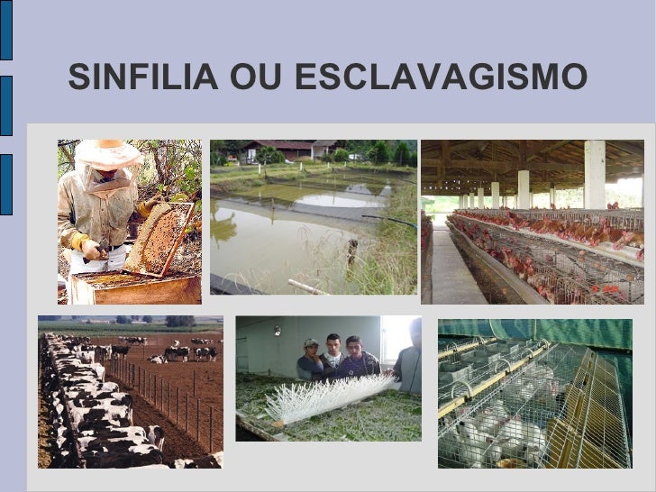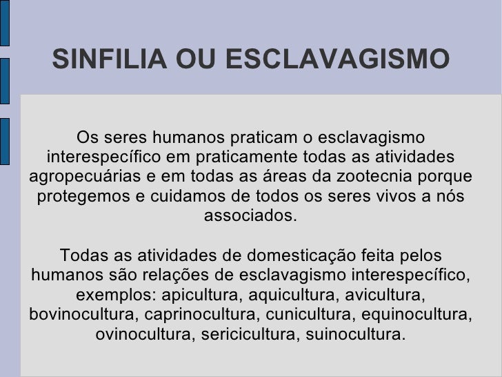 25. 25. SINFILIA OU ESCLAVAGISMO Os seres humanos praticam o esclavagismo interespecífico em praticamente todas as atividades agropecuárias e em todas as áreas da zootecnia porque protegemos e cuidamos de todos os seres vivos a nós associados. Todas as atividades de domesticação feita pelos humanos são relações de esclavagismo interespecífico, exemplos: apicultura, aquicultura, avicultura, bovinocultura, caprinocultura, cunicultura, equinocultura, ovinocultura, sericicultura, suinocultura.