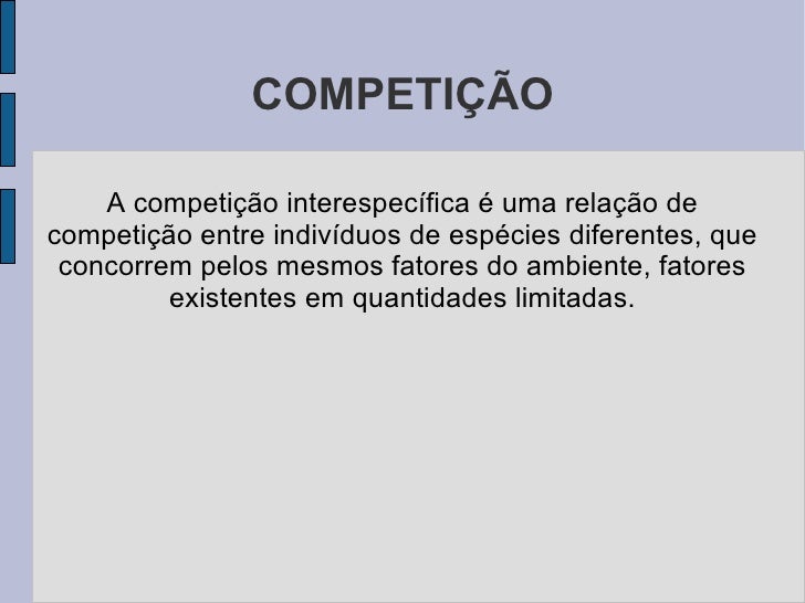30. 30. COMPETIÇÃO A competição interespecífica é uma relação de competição entre indivíduos de espécies diferentes, que concorrem pelos mesmos fatores do ambiente, fatores existentes em quantidades limitadas.