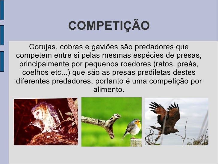 31. 31. COMPETIÇÃO Corujas, cobras e gaviões são predadores que competem entre si pelas mesmas espécies de presas, principalmente por pequenos roedores (ratos, preás, coelhos etc...) que são as presas prediletas destes diferentes predadores, portanto é uma competição por alimento.