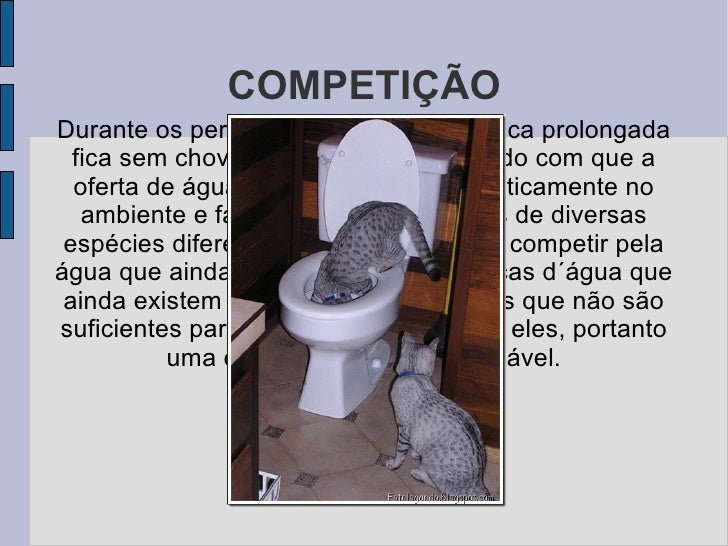 32. 32. COMPETIÇÃO Durante os períodos de estiagem ou seca prolongada fica sem chover durante meses fazendo com que a oferta de água potável se reduza drásticamente no ambiente e fazendo com que animais de diversas espécies diferentes sejam obrigados a competir pela água que ainda resta em pequenas poças d´água que ainda existem num lugar ou noutro mas que não são suficientes para matar a sede de todos eles, portanto uma competição por água potável.
