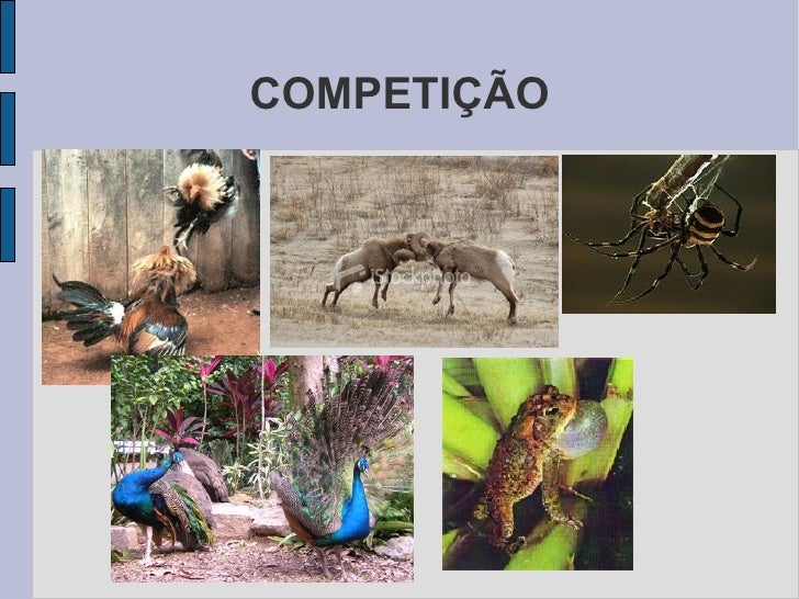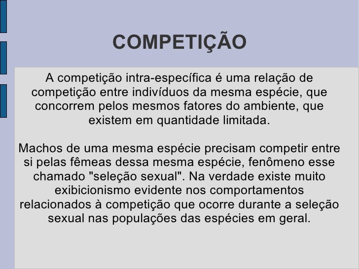 33. 33. COMPETIÇÃO A competição intra-específica é uma relação de competição entre indivíduos da mesma espécie, que concorrem pelos mesmos fatores do ambiente, que existem em quantidade limitada. Machos de uma mesma espécie precisam competir entre si pelas fêmeas dessa mesma espécie, fenômeno esse chamado "seleção sexual". Na verdade existe muito exibicionismo evidente nos comportamentos relacionados à competição que ocorre durante a seleção sexual nas populações das espécies em geral.