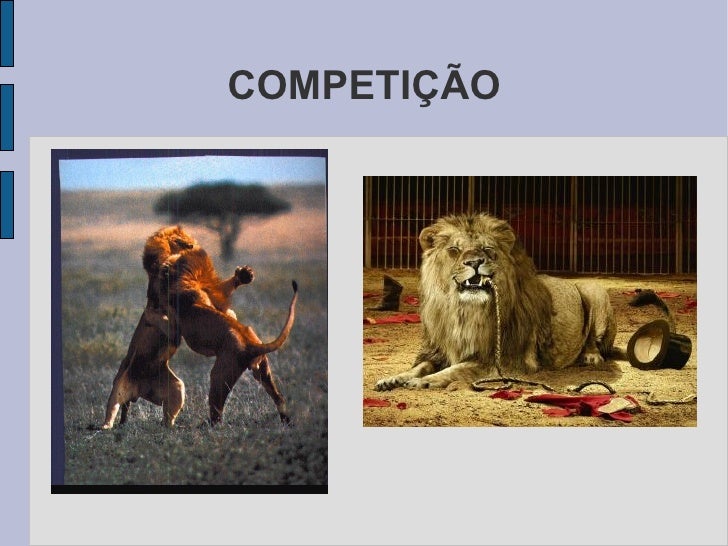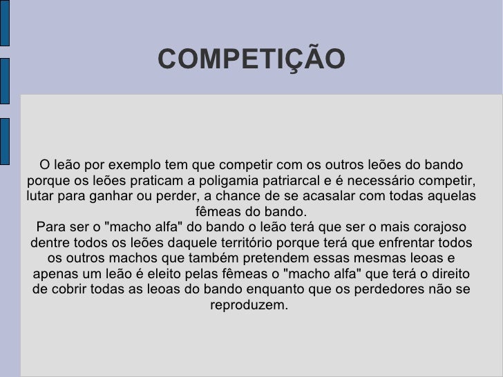 34. 34. COMPETIÇÃO O leão por exemplo tem que competir com os outros leões do bando porque os leões praticam a poligamia patriarcal e é necessário competir, lutar para ganhar ou perder, a chance de se acasalar com todas aquelas fêmeas do bando. Para ser o "macho alfa" do bando o leão terá que ser o mais corajoso dentre todos os leões daquele território porque terá que enfrentar todos os outros machos que também pretendem essas mesmas leoas e apenas um leão é eleito pelas fêmeas o "macho alfa" que terá o direito de cobrir todas as leoas do bando enquanto que os perdedores não se reproduzem.