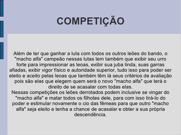 35. 35. COMPETIÇÃO Além de ter que ganhar a luta com todos os outros leões do bando, o "macho alfa" campeão nessas lutas tem também que exibir seu urro forte para impressionar as leoas, exibir sua juba linda, suas garras afiadas, exibir vigor físico e autoridade superior, tudo isso para poder ser eleito e aceito pelas leoas que também têm lá seus critérios de avaliação pois são elas que elegem quem será o novo "macho alfa" que terá o direito de se acasalar com todas elas. Nessas competições os leões derrotados podem inclusive se vingar do "macho alfa" e matar todos os filhotes dele, para com isso tirá-lo do poder e estimular novamente o cio das fêmeas para que outro "macho alfa" seja eleito e tenha a chance de acasalar e obter a sua própria descendência.