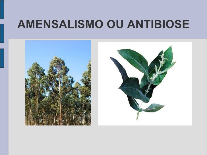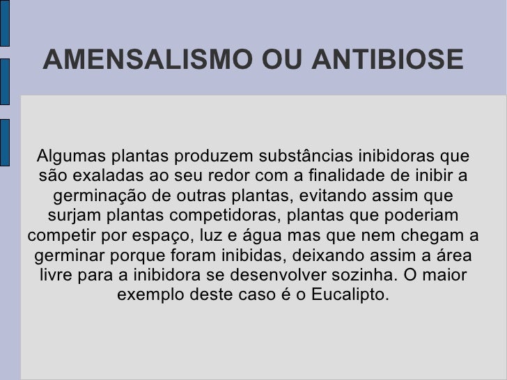 4. 4. AMENSALISMO OU ANTIBIOSE Algumas plantas produzem substâncias inibidoras que são exaladas ao seu redor com a finalidade de inibir a germinação de outras plantas, evitando assim que surjam plantas competidoras, plantas que poderiam competir por espaço, luz e água mas que nem chegam a germinar porque foram inibidas, deixando assim a área livre para a inibidora se desenvolver sozinha. O maior exemplo deste caso é o Eucalipto.