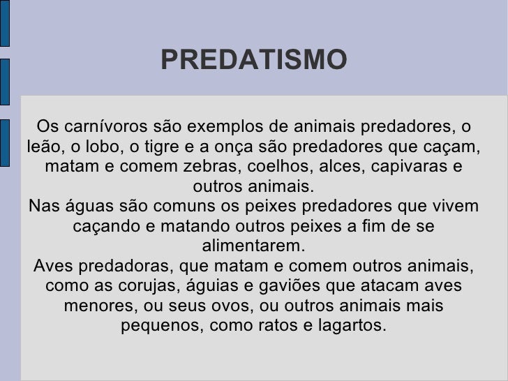 7. 7. PREDATISMO Os carnívoros são exemplos de animais predadores, o leão, o lobo, o tigre e a onça são predadores que caçam, matam e comem zebras, coelhos, alces, capivaras e outros animais. Nas águas são comuns os peixes predadores que vivem caçando e matando outros peixes a fim de se alimentarem. Aves predadoras, que matam e comem outros animais, como as corujas, águias e gaviões que atacam aves menores, ou seus ovos, ou outros animais mais pequenos, como ratos e lagartos.