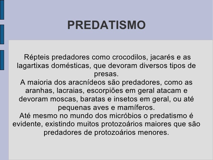 8. 8. PREDATISMO Répteis predadores como crocodilos, jacarés e as lagartixas domésticas, que devoram diversos tipos de presas. A maioria dos aracnídeos são predadores, como as aranhas, lacraias, escorpiões em geral atacam e devoram moscas, baratas e insetos em geral, ou até pequenas aves e mamíferos. Até mesmo no mundo dos micróbios o predatismo é evidente, existindo muitos protozoários maiores que são predadores de protozoários menores.
