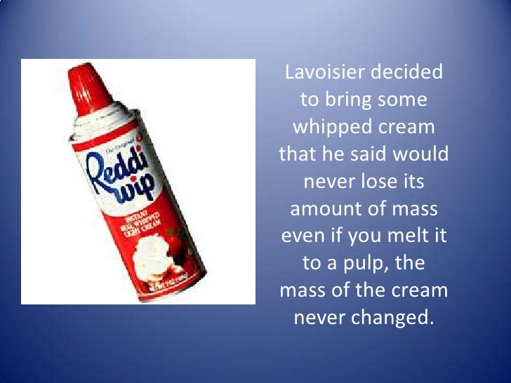 12. 12. Lavoisier decided to bring some whipped cream that he said would never lose its amount of mass even if you melt it to a pulp, the mass of the cream never changed.<br />