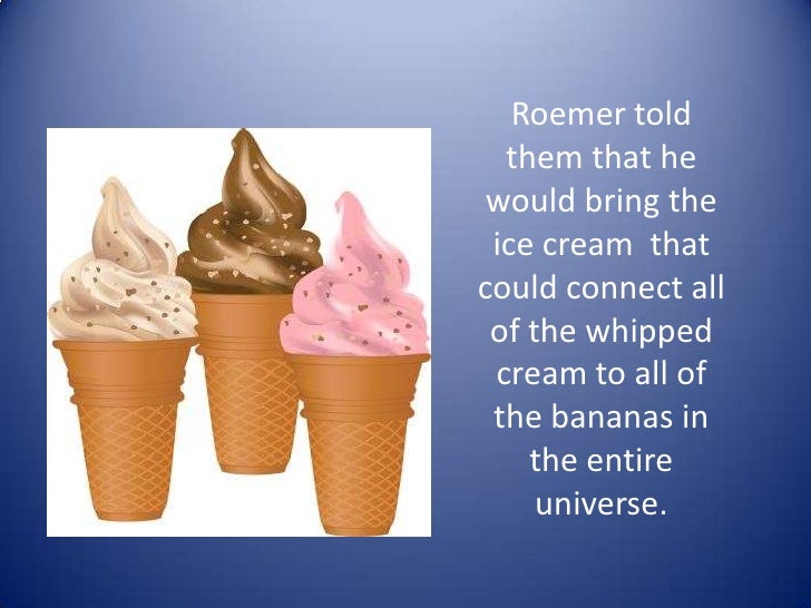 16. 16. Roemer told them that he would bring the ice cream that could connect all of the whipped cream to all of the bananas in the entire universe. <br />
