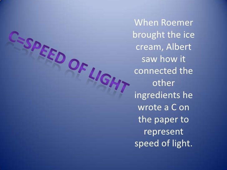 17. 17. When Roemer brought the ice cream, Albert saw how it connected the other ingredients he wrote a C on the paper to represent speed of light. <br />C=Speed of light <br />