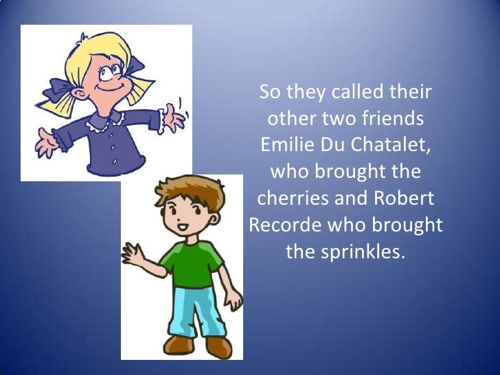 19. 19. So they called their other two friends Emilie Du Chatalet, who brought the cherries and Robert Recorde who brought the sprinkles. <br />