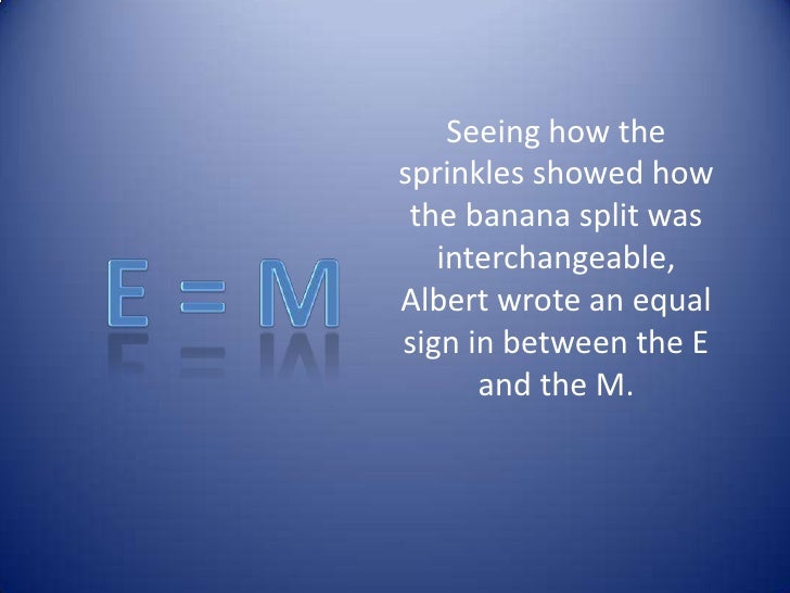 20. 20. Seeing how the sprinkles showed how the banana split was interchangeable, Albert wrote an equal sign in between the E and the M. <br />E = M <br />