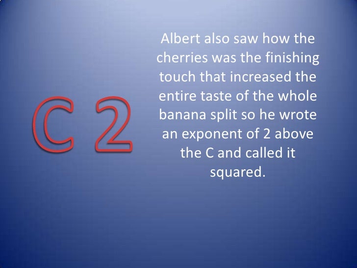 21. 21. Albert also saw how the cherries was the finishing touch that increased the entire taste of the whole banana split so he wrote an exponent of 2 above the C and called it squared. <br />C 2<br />