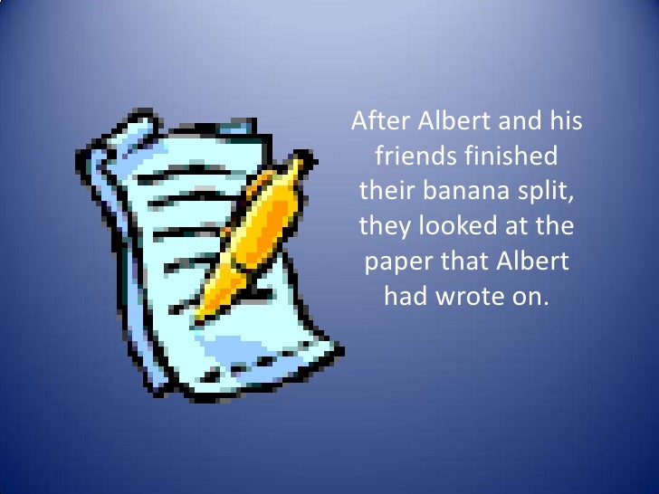 22. 22. After Albert and his friends finished their banana split, they looked at the paper that Albert had wrote on. <br />