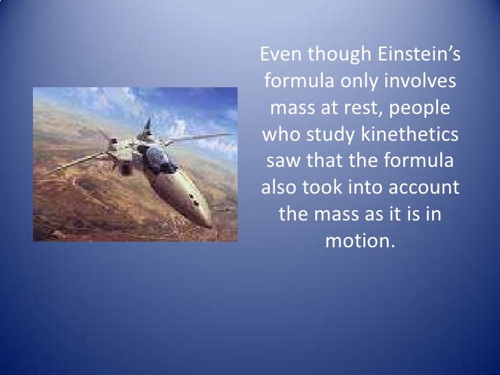 38. 38. Even though Einstein’s formula only involves mass at rest, people who study kinethetics saw that the formula also took into account the mass as it is in motion. <br />
