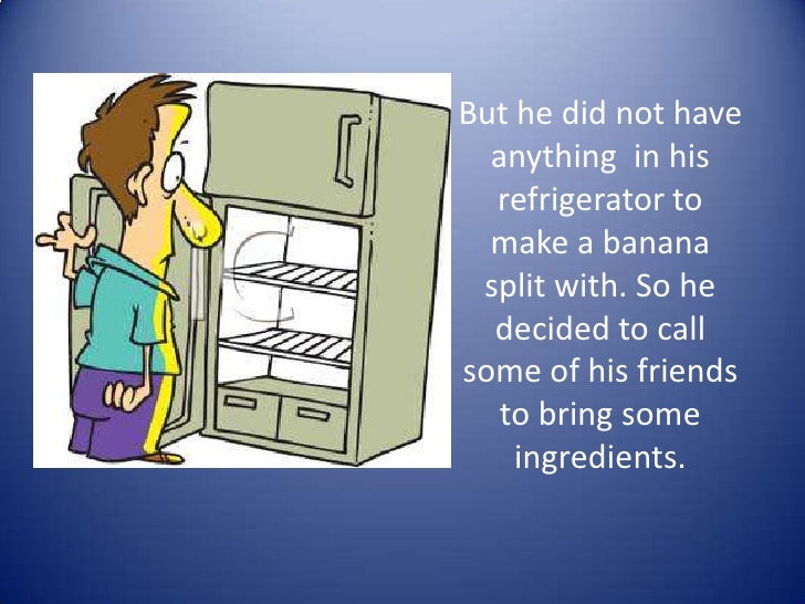 6. 6. But he did not have anything in his refrigerator to make a banana split with. So he decided to call some of his friends to bring some ingredients.<br />