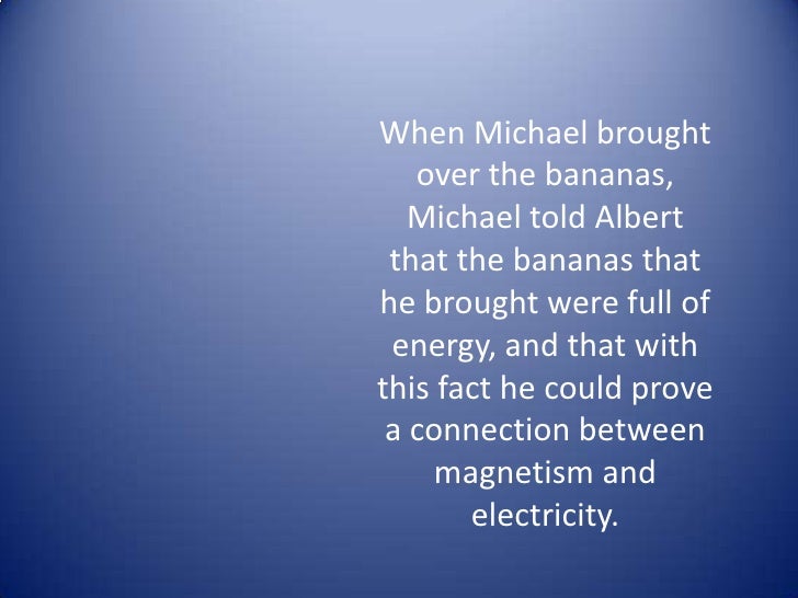 9. 9. When Michael brought over the bananas, Michael told Albert that the bananas that he brought were full of energy, and that with this fact he could prove a connection between magnetism and electricity. <br />
