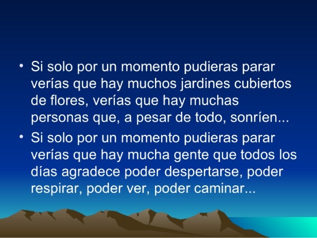 2. 2. " Si solo por un momento pudieras parar verías que hay muchos jardines cubiertos de flores, verías que hay muchas personas que, a pesar de todo, sonríen. .. o Si solo por un momento pudieras parar verías que hay mucha gente que todos los días agradece poder despertarse, poder respirar, poder ver, poder caminar. ..