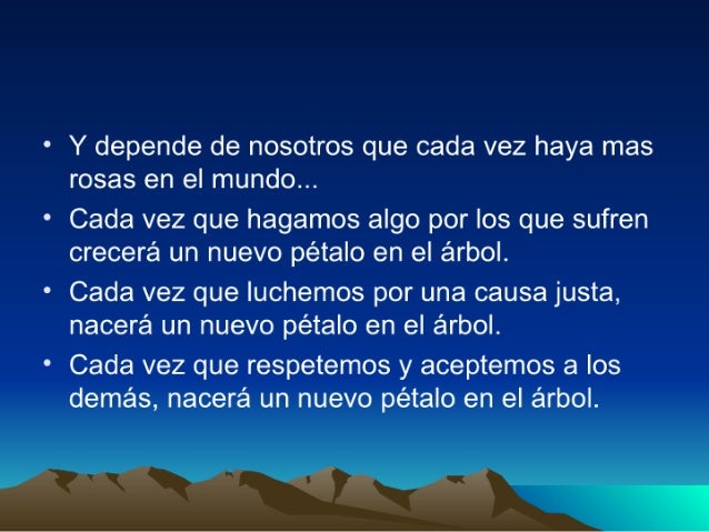 4. 4. ° Y depende de nosotros que cada vez haya mas rosas en el mundo. .. ° Cada vez que hagamos algo por los que sufren crecerá un nuevo pétalo en el árbol. ° Cada vez que Iuchemos por una causa justa, nacerá un nuevo pétalo en el árbol. ° Cada vez que respetemos y aceptemos a los demás, nacerá un nuevo pétalo en el árbol.