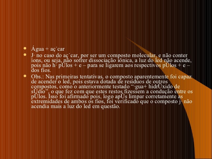 8. 11. <ul><li>Água + açúcar </li></ul><ul><li>Já no caso do açúcar, por ser um composto molecular, e não conter íons, ou seja, não sofrer dissociação iônica, a luz do led não acende, pois não há pólos + e – para se ligarem aos respectivos pólos + e – dos fios. </li></ul><ul><li>Obs.: Nas primeiras tentativas, o composto aparentemente foi capaz de acender o led, pois estava dotada de resíduos de outros compostos, como o anteriormente testado “água+ hidróxido de sódio”, o que fez com que estes restos fizessem a condução entre os pólos. Isso foi afirmado pois, logo após limpar corretamente as extremidades de ambos os fios, foi verificado que o composto já não acendia mais a luz do led em questão. </li></ul>
