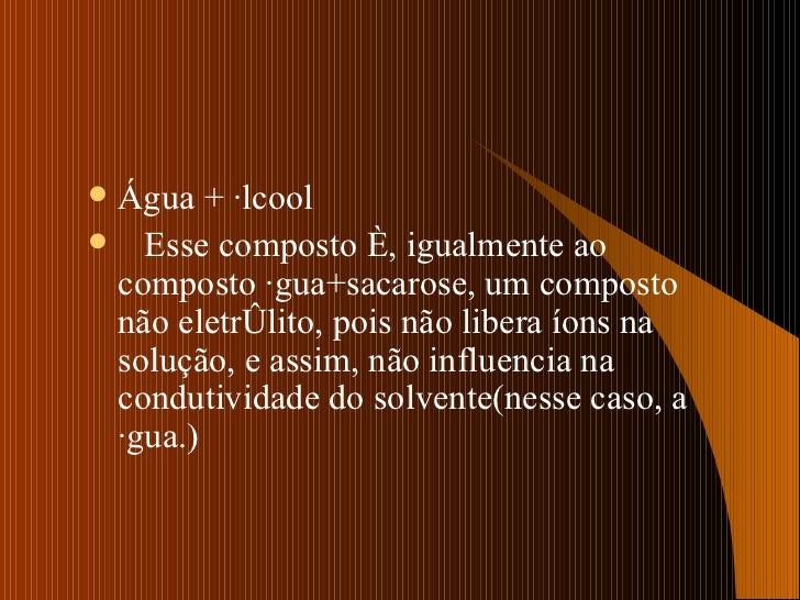 9. 12. <ul><li>Água + álcool </li></ul><ul><li>Esse composto é, igualmente ao composto água+sacarose, um composto não eletrólito, pois não libera íons na solução, e assim, não influencia na condutividade do solvente(nesse caso, a água.) </li></ul>
