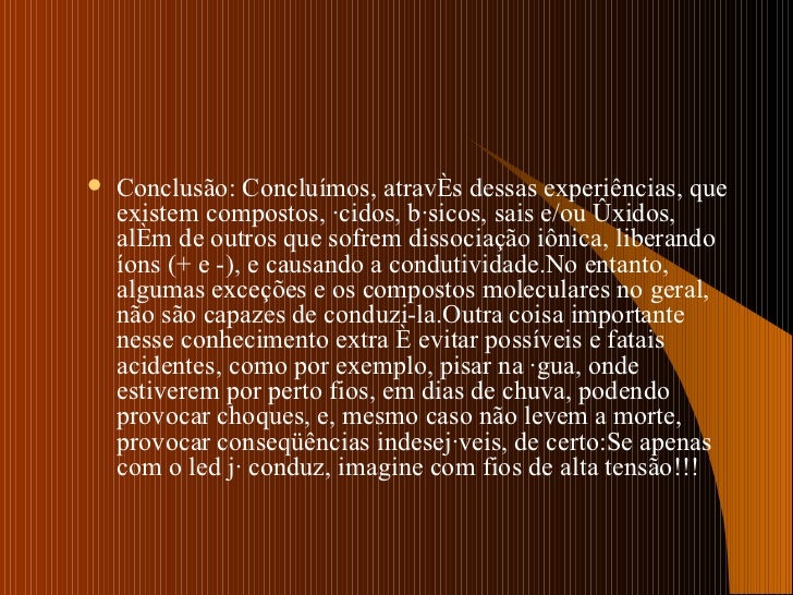10. 13. <ul><li>Conclusão: Concluímos, através dessas experiências, que existem compostos, ácidos, básicos, sais e/ou óxidos, além de outros que sofrem dissociação iônica, liberando íons (+ e -), e causando a condutividade.No entanto, algumas exceções e os compostos moleculares no geral, não são capazes de conduzi-la.Outra coisa importante nesse conhecimento extra é evitar possíveis e fatais acidentes, como por exemplo, pisar na água, onde estiverem por perto fios, em dias de chuva, podendo provocar choques, e, mesmo caso não levem a morte, provocar conseqüências indesejáveis, de certo:Se apenas com o led já conduz, imagine com fios de alta tensão!!! </li></ul>
