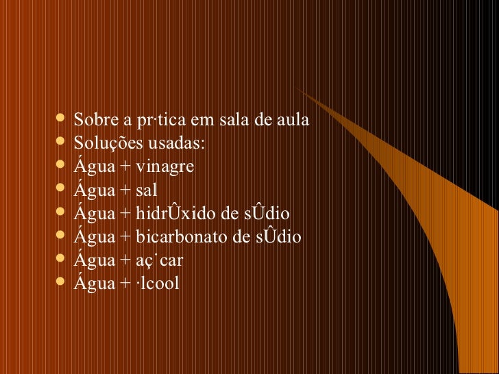 2. 2. <ul><li>Sobre a prática em sala de aula </li></ul><ul><li>Soluções usadas: </li></ul><ul><li>Água + vinagre </li></ul><ul><li>Água + sal </li></ul><ul><li>Água + hidróxido de sódio </li></ul><ul><li>Água + bicarbonato de sódio </li></ul><ul><li>Água + açúcar </li></ul><ul><li>Água + álcool </li></ul>