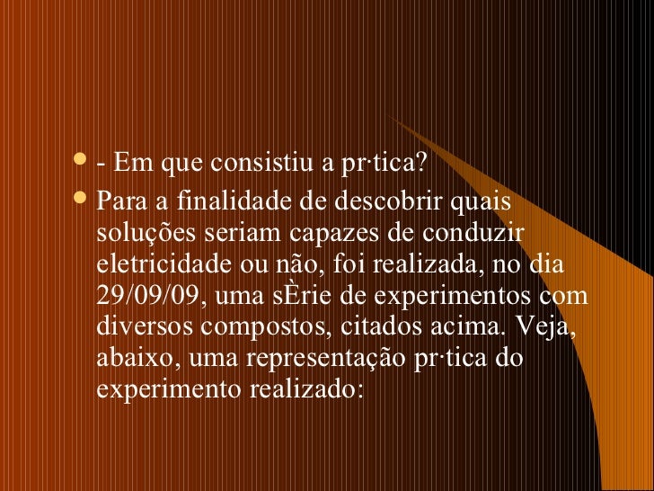 3. 4. <ul><li>- Em que consistiu a prática? </li></ul><ul><li>Para a finalidade de descobrir quais soluções seriam capazes de conduzir eletricidade ou não, foi realizada, no dia 29/09/09, uma série de experimentos com diversos compostos, citados acima. Veja, abaixo, uma representação prática do experimento realizado: </li></ul>
