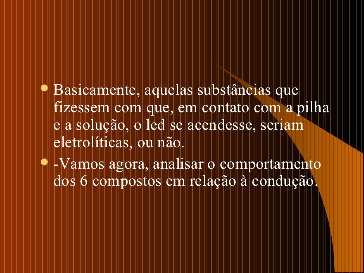 4. 6. <ul><li>Basicamente, aquelas substâncias que fizessem com que, em contato com a pilha e a solução, o led se acendesse, seriam eletrolíticas, ou não. </li></ul><ul><li>-Vamos agora, analisar o comportamento dos 6 compostos em relação à condução. </li></ul>