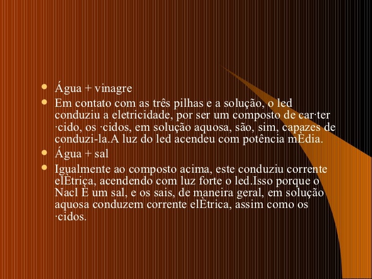 5. 7. <ul><li>Água + vinagre </li></ul><ul><li>Em contato com as três pilhas e a solução, o led conduziu a eletricidade, por ser um composto de caráter ácido, os ácidos, em solução aquosa, são, sim, capazes de conduzi-la.A luz do led acendeu com potência média. </li></ul><ul><li>Água + sal </li></ul><ul><li>Igualmente ao composto acima, este conduziu corrente elétrica, acendendo com luz forte o led.Isso porque o Nacl é um sal, e os sais, de maneira geral, em solução aquosa conduzem corrente elétrica, assim como os ácidos. </li></ul>