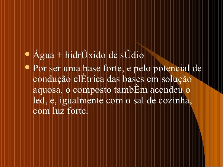 6. 9. <ul><li>Água + hidróxido de sódio </li></ul><ul><li>Por ser uma base forte, e pelo potencial de condução elétrica das bases em solução aquosa, o composto também acendeu o led, e, igualmente com o sal de cozinha, com luz forte. </li></ul>