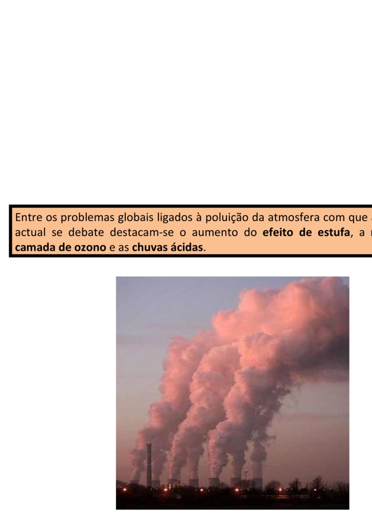 2. 2. Entre os problemas globais ligados à poluição da atmosfera com que a civilização actual se debate destacam-se o aumento do efeito de estufa , a redução da camada de ozono e as chuvas ácidas .