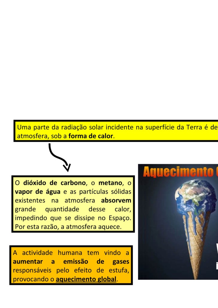 3. 3. Uma parte da radiação solar incidente na superfície da Terra é devolvida à atmosfera, sob a forma de calor . O dióxido de carbono , o metano , o vapor de água e as partículas sólidas existentes na atmosfera absorvem grande quantidade desse calor, impedindo que se dissipe no Espaço. Por esta razão, a atmosfera aquece. A actividade humana tem vindo a aumentar a emissão de gases responsáveis pelo efeito de estufa, provocando o aquecimento global .