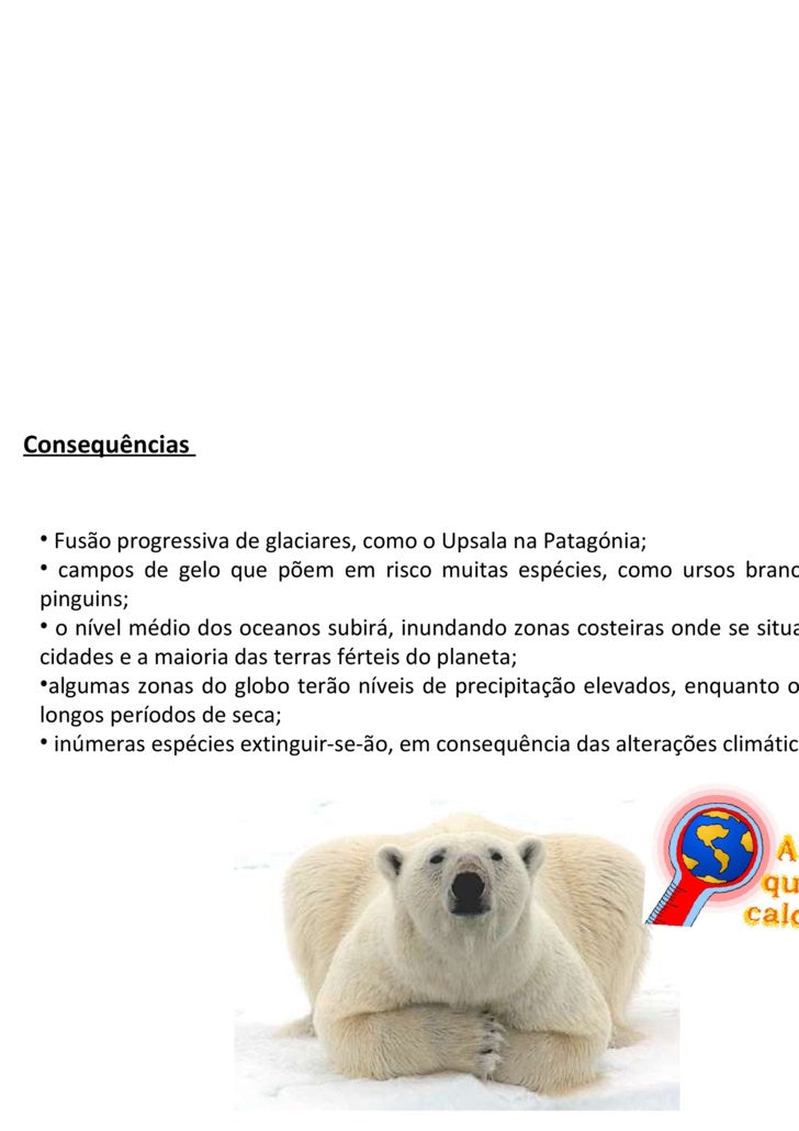 4. 4. Consequências <ul><li>Fusão progressiva de glaciares, como o Upsala na Patagónia; </li></ul><ul><li>campos de gelo que põem em risco muitas espécies, como ursos brancos, focas e pinguins; </li></ul><ul><li>o nível médio dos oceanos subirá, inundando zonas costeiras onde se situam algumas cidades e a maioria das terras férteis do planeta; </li></ul><ul><li>algumas zonas do globo terão níveis de precipitação elevados, enquanto outros terão longos períodos de seca; </li></ul><ul><li>inúmeras espécies extinguir-se-ão, em consequência das alterações climáticas. </li></ul>