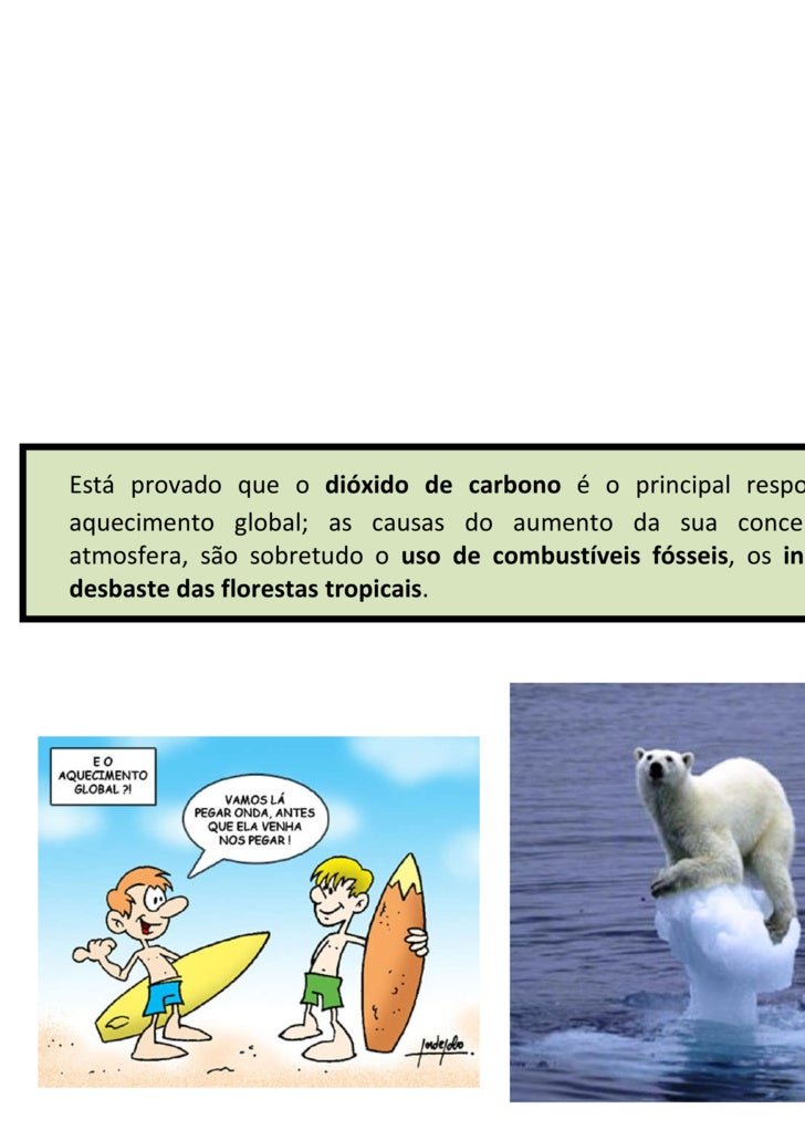 5. 5. <ul><li>Está provado que o dióxido de carbono é o principal responsável pelo aquecimento global; as causas do aumento da sua concentração, na atmosfera, são sobretudo o uso de combustíveis fósseis , os incêndios e o desbaste das florestas tropicais . </li></ul>