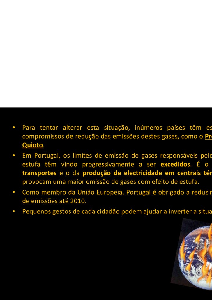 6. 6. <ul><li>Para tentar alterar esta situação, inúmeros países têm estabelecido compromissos de redução das emissões destes gases, como o Protocolo de Quioto . </li></ul><ul><li>Em Portugal, os limites de emissão de gases responsáveis pelo efeito de estufa têm vindo progressivamente a ser excedidos . É o sector de transportes e o da produção de electricidade em centrais térmicas que provocam uma maior emissão de gases com efeito de estufa. </li></ul><ul><li>Como membro da União Europeia, Portugal é obrigado a reduzir esses tipo de emissões até 2010. </li></ul><ul><li>Pequenos gestos de cada cidadão podem ajudar a inverter a situação. </li></ul>