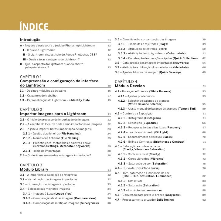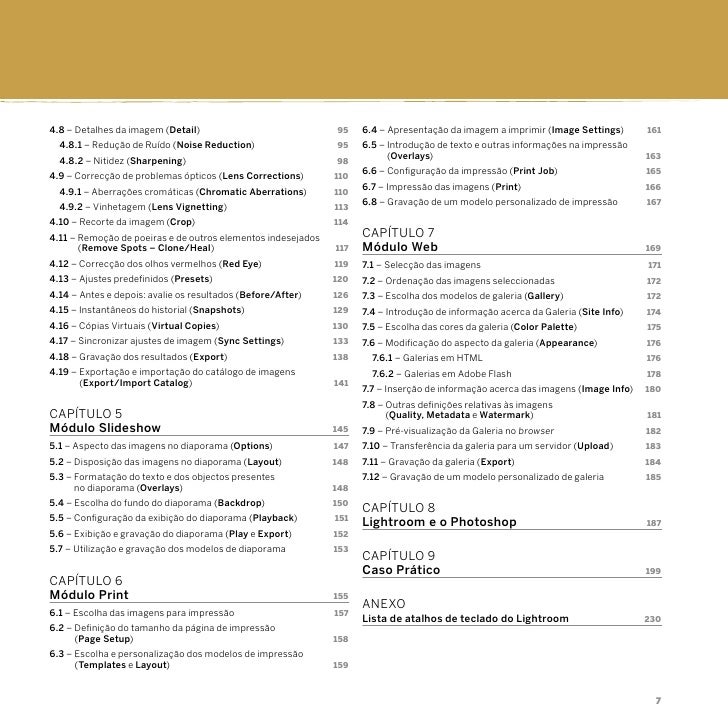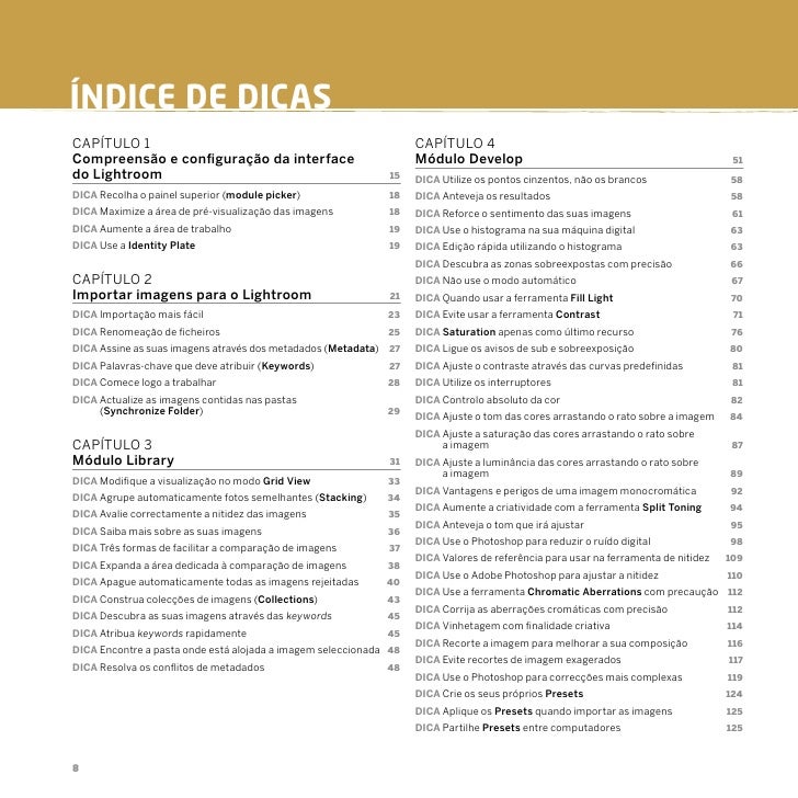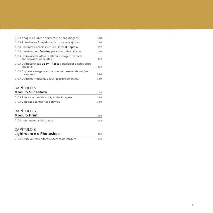 11. 11. Dica Apague as luzes e concentre-se nas imagens 128 Dica Actualize os Snapshots com os novos ajustes 130 Dica Encontre as cópias virtuais (Virtual Copies) 132 Dica use o módulo Develop para sincronizar ajustes 136 Dica utilize a tecla Alt para alterar a imagem de onde são copiados os ajustes 137 Dica utilize a função Copy – Paste para copiar ajustes entre imagens 137 Dica Exporte a imagem actual com as mesmas definições da anterior 140 Dica Utilize os modos de exportação predefinidos. 140 CAPítuLO 5 Módulo Slideshow 145 Dica Altere a ordem de exibição das imagens 146 Dica Coloque acentos nas palavras 149 CAPítuLO 6 Módulo Print 155 Dica Imprima fotos tipo passe 162 CAPítuLO 8 Lightroom e o Photoshop 187 Dica utilize outros editores externos de imagem 192