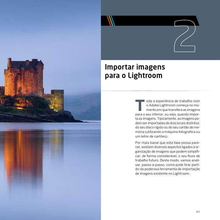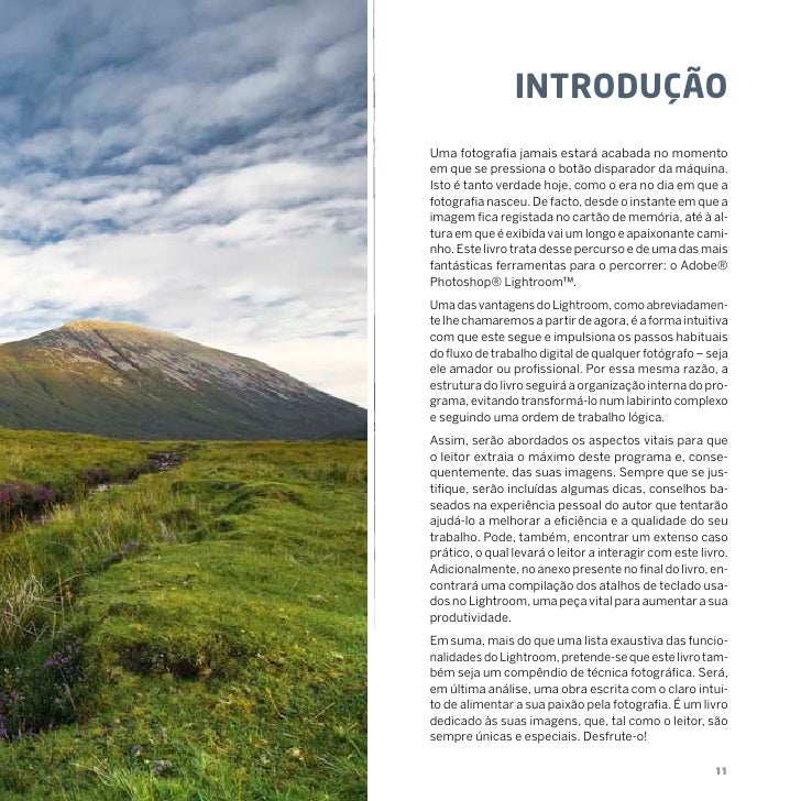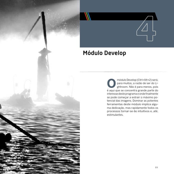 24. 24. Obra de referência, em língua portuguesa, sobre Fotografia Digital e o software Photoshop Lightroom da Adobe, repleta de exemplos práticos e com centenas de imagens que inspirarão o leitor a transformar os seus métodos de trabalho e a extrair o máximo impacto das suas fotografias. Escrita por um reputado fotógrafo profissional − já com múltiplos prémios nacionais e internacionais no seu curriculum − que conhece bem as necessidades dos fotógrafos, amadores ou profissionais, na organização, edição e apresentação das suas imagens. Com muitos e apelativos exemplos − resultado do trabalho fotográfico do autor em diversos continentes −, o livro revela as principais ferramentas e técnicas do Adobe Photoshop Lightroom bem como dezenas de segredos e truques que o leitor poderá repetir com esta aplicação da nova geração de software desenhada especificamente para trabalhos fotográficos. É, por esses motivos, uma obra indispensável para integrar esta nova aplicação revolucionária da Adobe no seu fluxo de trabalho, ajudando o leitor a criar as mais fantásticas imagens.