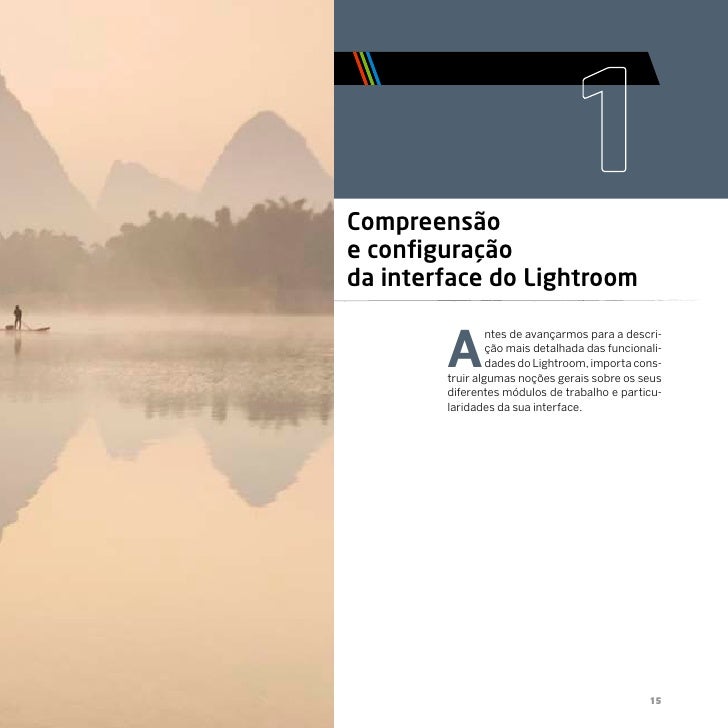 14. 14. Compreensão e configuração da interface do Lightroom a ntes de avançarmos para a descri- ção mais detalhada das funcionali- dades do Lightroom, importa cons- truir algumas noções gerais sobre os seus diferentes módulos de trabalho e particu- laridades da sua interface. 15