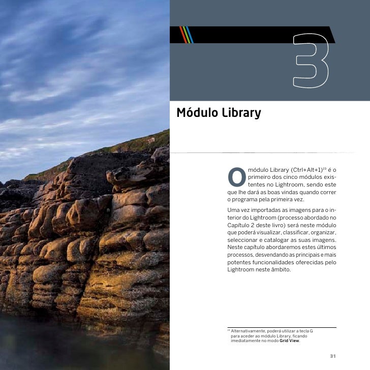 16. 16. Módulo Library o módulo Library (Ctrl+Alt+1)19 é o primeiro dos cinco módulos exis- tentes no Lightroom, sendo este que lhe dará as boas vindas quando correr o programa pela primeira vez. uma vez importadas as imagens para o in- terior do Lightroom (processo abordado no Capítulo 2 deste livro) será neste módulo que poderá visualizar, classificar, organizar, seleccionar e catalogar as suas imagens. Neste capítulo abordaremos estes últimos processos, desvendando as principais e mais potentes funcionalidades oferecidas pelo Lightroom neste âmbito. Alternativamente, poderá utilizar a tecla G 19 para aceder ao módulo Library, ficando imediatamente no modo Grid View. 31