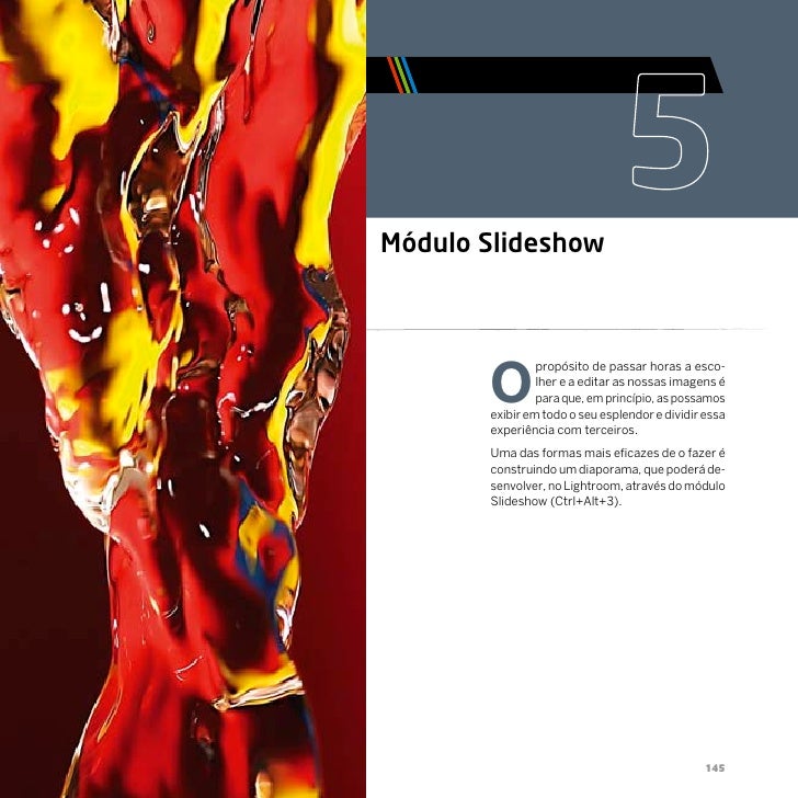 18. 18. Módulo Slideshow o propósito de passar horas a esco- lher e a editar as nossas imagens é para que, em princípio, as possamos exibir em todo o seu esplendor e dividir essa experiência com terceiros. Uma das formas mais eficazes de o fazer é construindo um diaporama, que poderá de- senvolver, no Lightroom, através do módulo Slideshow (Ctrl+Alt+3). 145
