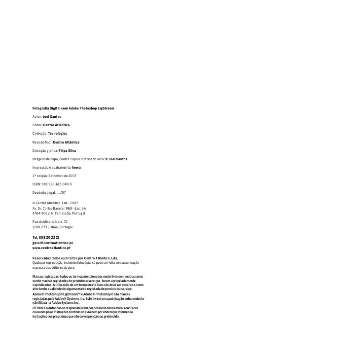 4. 4. Fotografia Digital com Adobe Photoshop Lightroom Autor: Joel Santos Editor: Centro Atlântico Colecção: Tecnologias Revisão final: Centro Atlântico Direcção gráfica: Filipa Silva Imagens de capa, contra-capa e interior do livro: © Joel Santos Impressão e acabamento: Inova 1.ª edição: Setembro de 2007 ISBN: 978-989-615-049-5 Depósito Legal: ..../07 © Centro Atlântico, Lda., 2007 Av. Dr. Carlos Bacelar, 968 - Esc. 1-A 4764-901 V. N. Famalicão, Portugal Rua da Misericórdia, 76 1200-273 Lisboa, Portugal Tel. 808 20 22 21 geral@centroatlantico.pt www.centroatlantico.pt Reservados todos os direitos por Centro Atlântico, Lda. Qualquer reprodução, incluindo fotocópia, só pode ser feita com autorização expressa dos editores da obra. Marcas registadas: todos os termos mencionados neste livro conhecidos como sendo marcas registadas de produtos e serviços, foram apropriadamente capitalizados. A utilização de um termo neste livro não deve ser encarada como afectando a validade de alguma marca registada de produto ou serviço. Adobe® Photoshop® Lightroom™ e Adobe® Photoshop® são marcas registadas pela Adobe® Systems Inc. Este livro é uma publicação independente não filiada na Adobe Systems Inc. O Editor e o Autor não se responsabilizam por possíveis danos morais ou físicos causados pelas instruções contidas no livro nem por endereços Internet ou instruções dos programas que não correspondam ao pretendido.