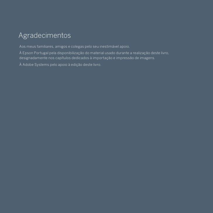 6. 6. Agradecimentos Aos meus familiares, amigos e colegas pelo seu inestimável apoio. À Epson Portugal pela disponibilização do material usado durante a realização deste livro, designadamente nos capítulos dedicados à importação e impressão de imagens. À Adobe Systems pelo apoio à edição deste livro.