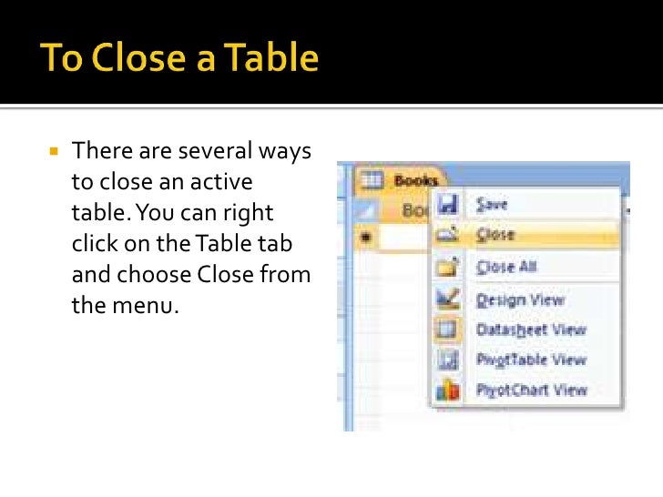 10. 10. To Close a Table<br />There are several ways to close an active table. You can right click on the Table tab and choose Close from the menu.<br />