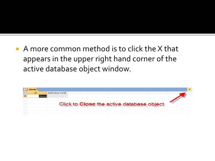 11. 11. A more common method is to click the X that appears in the upper right hand corner of the active database object window.<br />