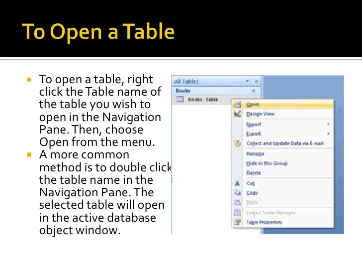12. 12. To Open a Table<br />To open a table, right click the Table name of the table you wish to open in the Navigation Pane. Then, choose Open from the menu.<br />A more common method is to double click the table name in the Navigation Pane. The selected table will open in the active database object window.<br />