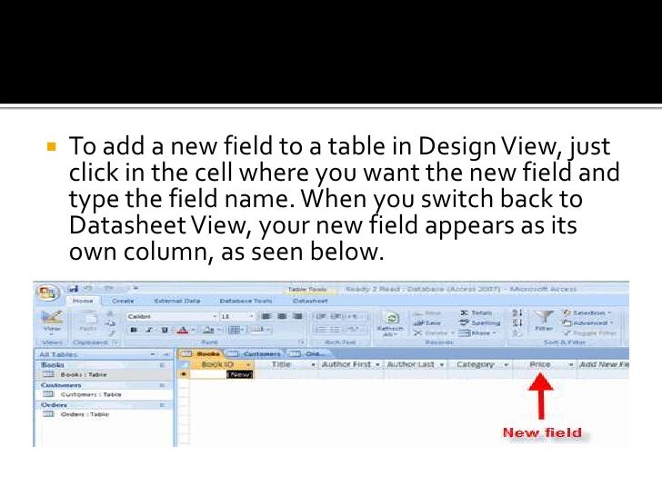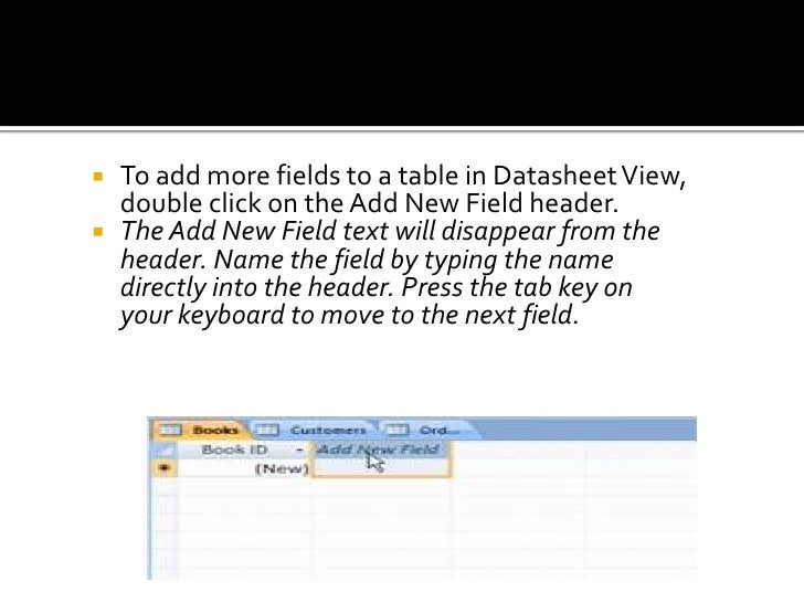 15. 15. Adding Fields in Datasheet View<br />By default, Access 2007 creates one field in each new table, the ID field. This field auto-numbers to give each record in the table a unique number identifier. Recall that records are the rows in a table.<br /><ul><li>TIP: You may want to rename the ID field with a unique name, since the ID field appears automatically in every table you create. While this is not necessary, it may help avoid confusion when setting up table relationships.</li></li></ul><li>To add more fields to a table in Datasheet View, double click on the Add New Field header.<br />The Add New Field text will disappear from the header. Name the field by typing the name directly into the header. Press the tab key on your keyboard to move to the next field.<br />