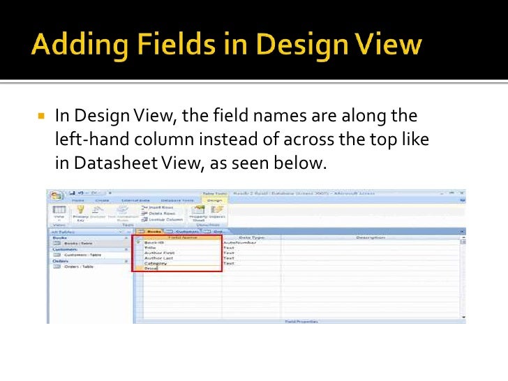 16. 16. Adding Fields in Design View<br />In Design View, the field names are along the left-hand column instead of across the top like in Datasheet View, as seen below.<br />