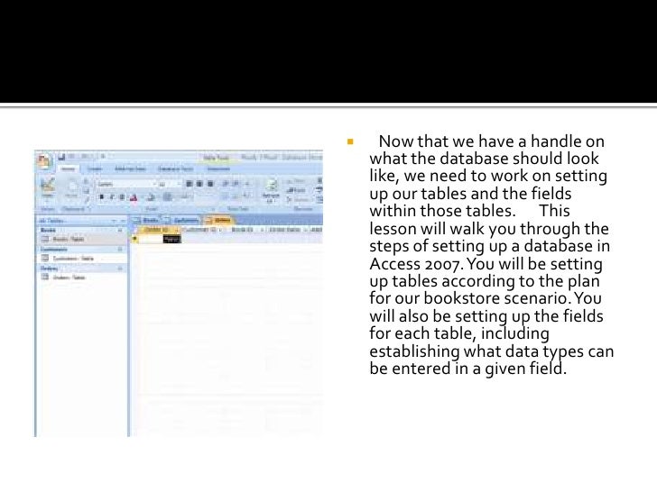 This lesson will walk you through the steps of setting up a database in Access 2007. You will be setting up tables according to the plan for our bookstore scenario. You will also be setting up the fields for each table, including establishing what data types can be entered in a given field.<br />
